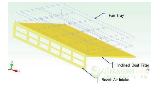 保持过滤器与风扇的平行是一大拥有其主要优势的选择:过滤器的提取非常符合人体工程学。我们不得不增加系统高度至25毫米,同时将过滤器的尺寸被限制为系统的深度和宽度。增加表面应减少压力下降,同时增加维修的次数。使用进气口对角线来增加表面的空气进入量。这个概念在空调系统中经常被使用。我们证实了这一定位,如图3所示,其可以说是最好的模拟。