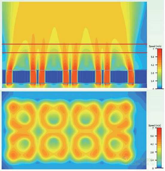 在创建一个组件,使每个插槽的气流均匀统一之前,我们决定看看仿真模拟空气流量,而不考虑漩涡。我们观察到在远离风扇75毫米的一定距离,速度变化仍然非常重要(图8)。